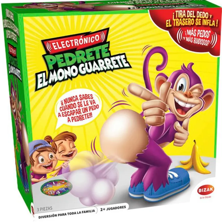 Juego Pedrete el mono guarrete para toda la familia, que combina dos cosas con las que no podrás parar de reír, el mono y los pedos. Para jugar tendrás que girar la ruleta con el plátano, tirar del dedo de Pedrete y observar cómo se infla su trasero… ¡No se sabe cuánto aguantará! Si provocas que se tire un pedo… ¡Habrás perdido! Para 2 jugadores o más. Recomendado a partir de 4 años.