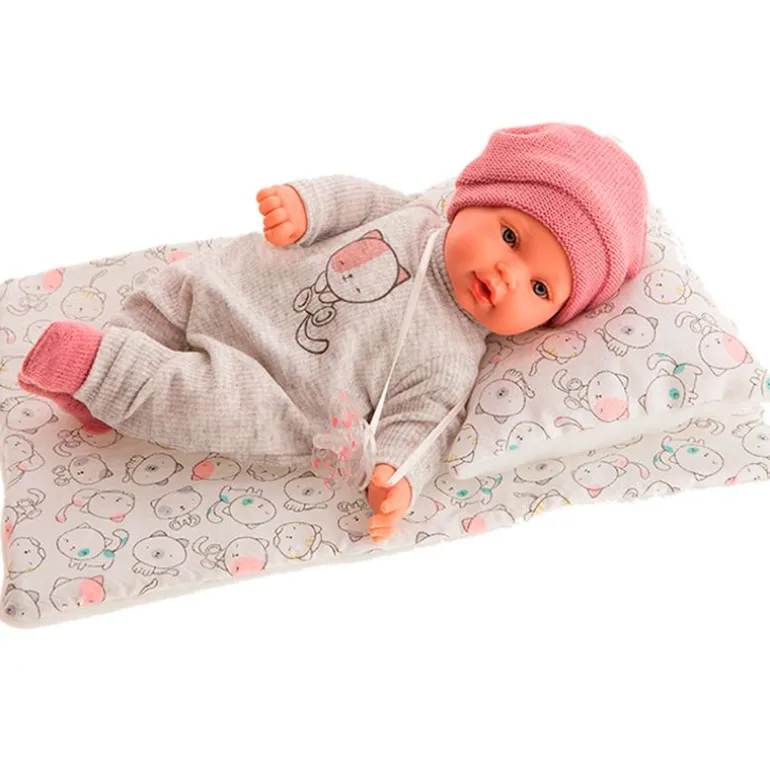 Kiko Gato es un muñeco bebé que descansa en un cojín en forma de luna. Viene acompañado de un gorro, un chupete, un pijama, calcetines, un cojín y un colchón. Sus extremidades están fabricadas en vinilo y su cuerpo es blandito. Tiene un tamaño de 27 cm aproximadamente. Si le quitar el chupete llora. Funciona con 3 pilas LR44 incluidas. La muñeca NO es sexada. Recomendado a partir de 3 años. Al ser una muñeca fabricada de manera artesanal, podría sufrir variaciones respecto a las imágenes, ya que no hay dos muñecas iguales. Es un producto artesanal, por lo que requiere unos cuidados especiales: No se puede bañar y no se puede limpiar con jabones, toallitas o productos que contengan alcohol, ya que dañarían la pintura. La muñeca no se puede rozar con telas que puedan desteñir, como por ejemplo la tela vaquera. Es un artículo de colección, por lo que no se puede pintar con ningún tipo de producto, ya que el vinilo lo absorbería. Sus pestañas son muy delicadas, hay que tener cuidado al limpiarlas, ya que podrían deteriorarse o romperse. Sus extremidades (cabeza, brazos y piernas) se tienen que girar con sumo cuidado para evitar desgarros. Además, Muñecas Antonio Juan dispone de «La Peque Clínica» para cualquier problema que pudieras tener con tu muñeca. Su departamento técnico te ayudará a recuperar el buen aspecto de tu bebé (servicio a través de su página web).