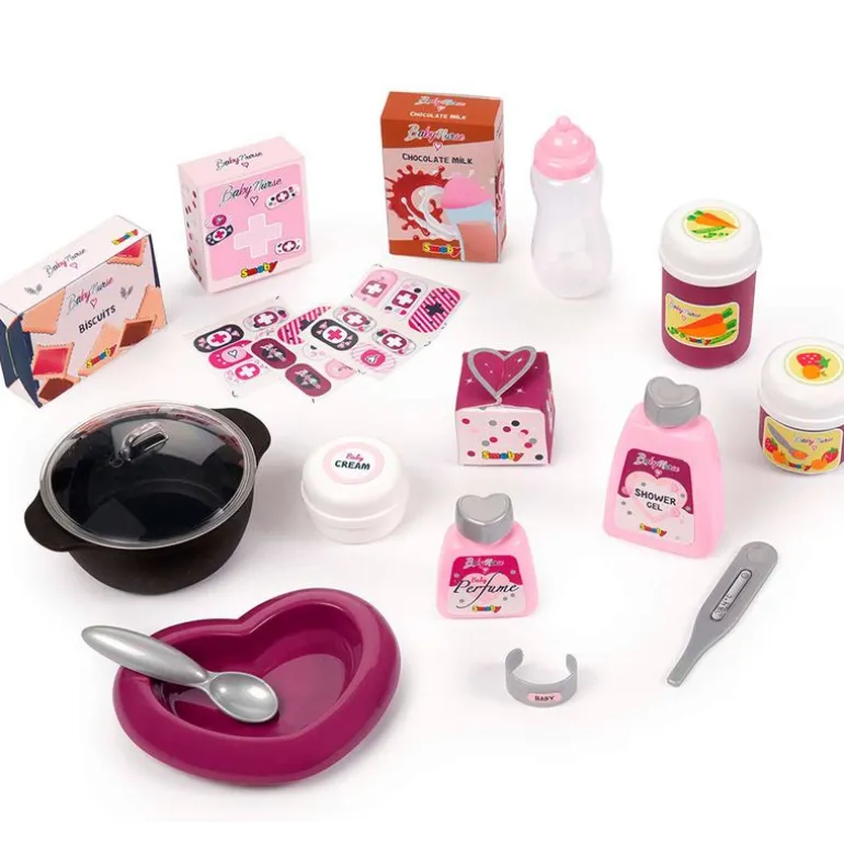 Contiene un biberón, cajitas, 2 botes de comida de bebé, 3 botes de cuidados para el bebé, un termómetro, una pulsera, tiritas, un plato con cuchara y una olla.