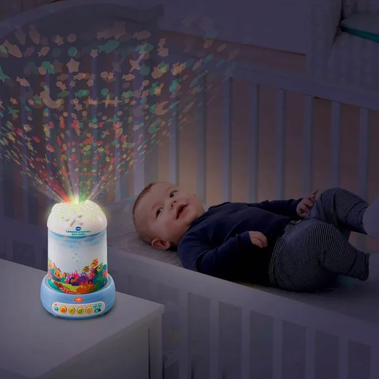 Lámpara proyector para mesita de la colección Vtech, que ayudará a relajar a tu bebé para que pueda conciliar el sueño rápidamente.