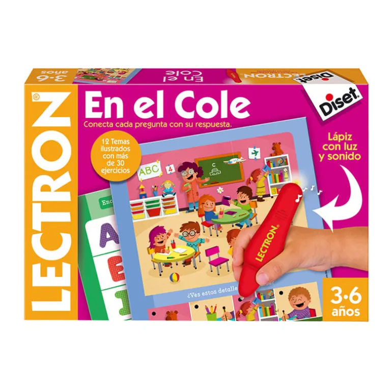 Completo juguete educativo de preguntas y respuestas. Lectron es fácil de jugar y gracias a su sistema auto-correctivo el niñ@ podrá comprobar si está en lo cierto. Incluye 12 láminas ilustradas con más de 30 ejercicios con el tema «en el cole», para conocer los diferentes ambientes y elementos que se encuentras en el entorno escolar. Edad recomendada de 3 a 6 años.