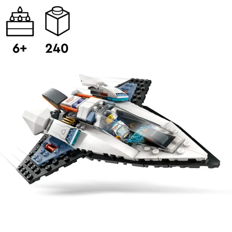 Pack de la colección Lego City, compuesto de 240 piezas, con las que podrás construir la nave espacial interestelar. Su diseño ultraveloz permite una exploración espacial óptima. Inserta una batería de juguete para activar los propulsores. Contiene un dron que además es una mochila propulsora. Recomendado a partir de 6 años.