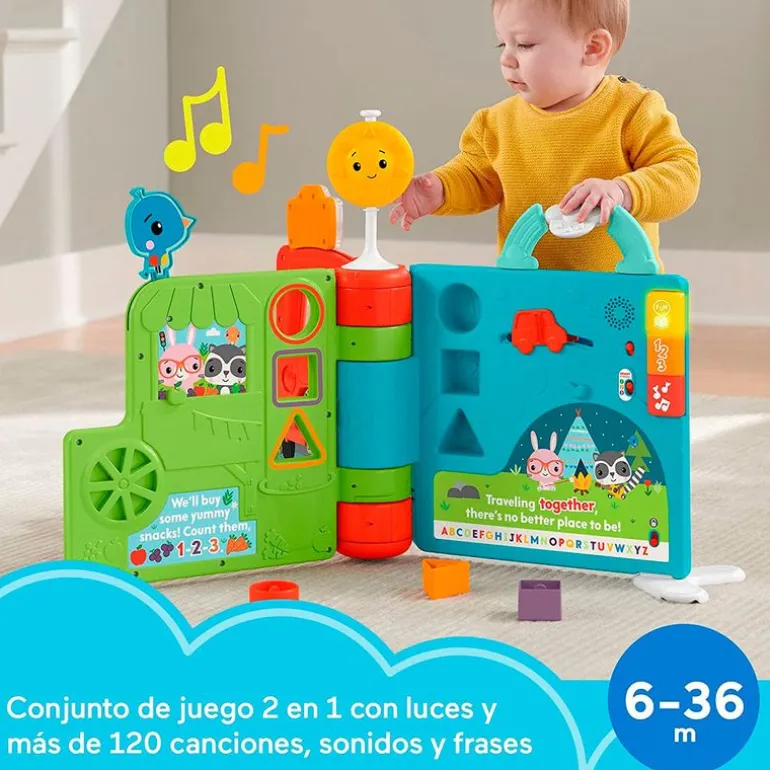 Este libro está lleno de sorpresas para l@s más pequeñ@s de la casa ¡Es gigante! Pasará de ser un libro de cuentos plano a un sólido centro de actividades vertical para tu el bebé siga creciendo y aprendiendo. Podrá acompañar a los simpáticos personajes de la historia en un mágico viaje a través de tres páginas repletas de actividades interactivas y tres niveles con canciones, sonidos y frases. Al apretar los botones luminosos, activarán más de 120 canciones, sonidos y frases para aprender. En el interior encontrarás 3 piezas de quita y pon para poder ordenar, encajar y guardar en el libro. Incluye actividades interactivas en la parte superior, la bolita en forma de sol y el pajarito. Funciona con pilas NO incluidas. Recomendado de 6 meses a 3 años.