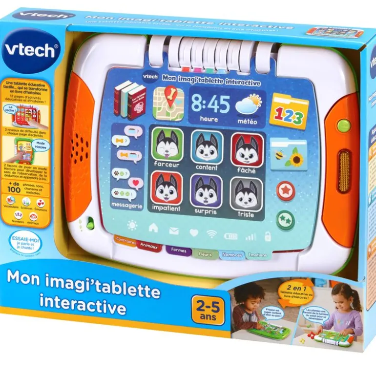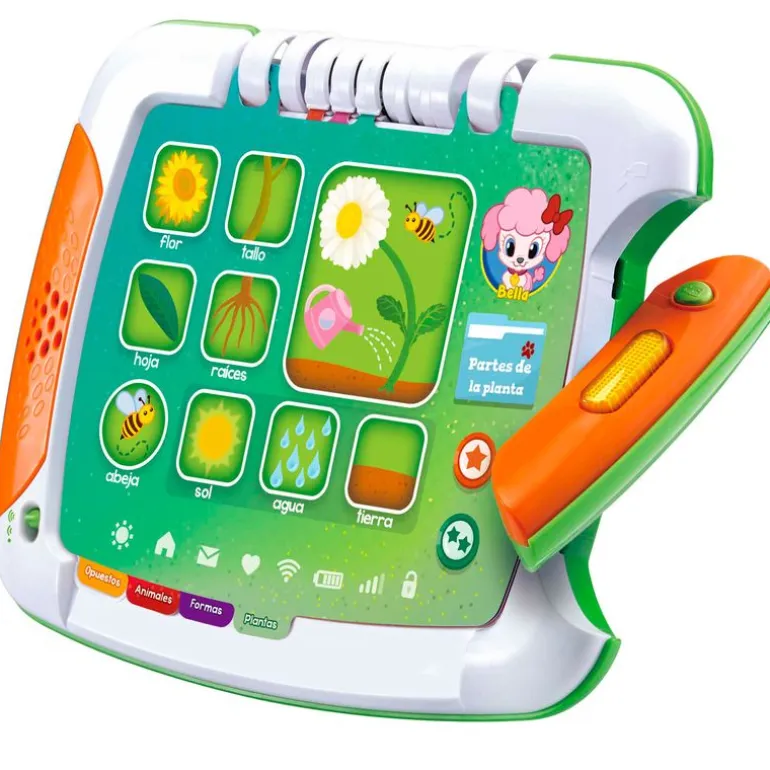 Dispone de un botón con luz para escuchar diferentes canciones y frases. También un sensor para identificar los dos lados del juego: horizontal para la Tablet y vertical para el libro.