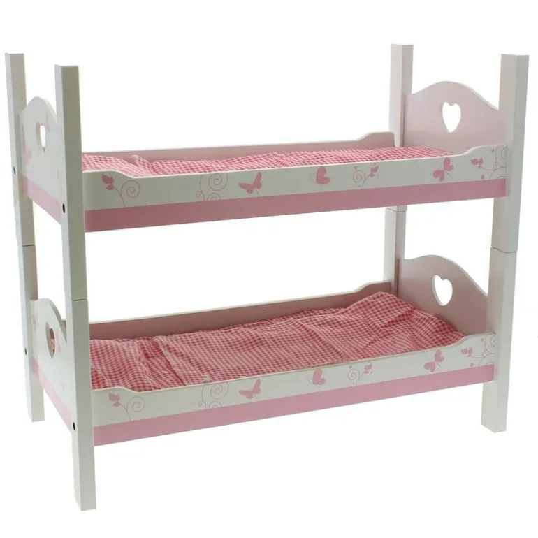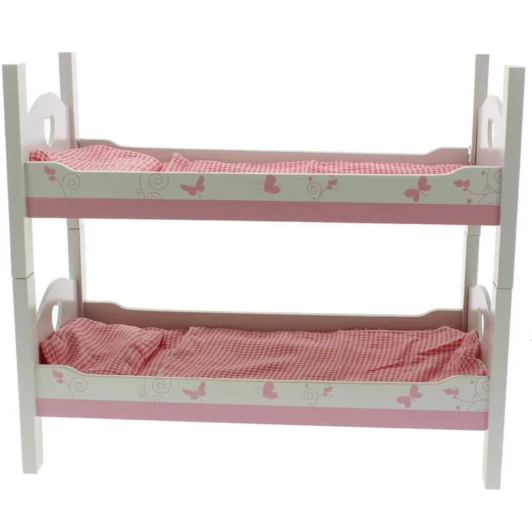 Pon a tus muñecos a dormir en esta preciosa litera blanca, con bonitos detalles en color rosa. La litera se puede separar para transformarla en dos camitas independientes. Ropita de cama incluida. NO INCLUYE MUÑECOS.