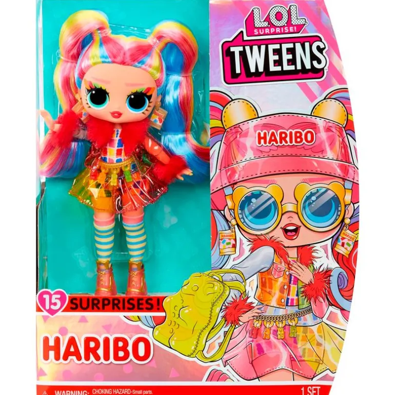 Adorable muñeca de la colección LOL Surprise Tweens con rasgos bonitos, pelo arcoíris en coletas y moda con temática inspirada en la marca Haribo.