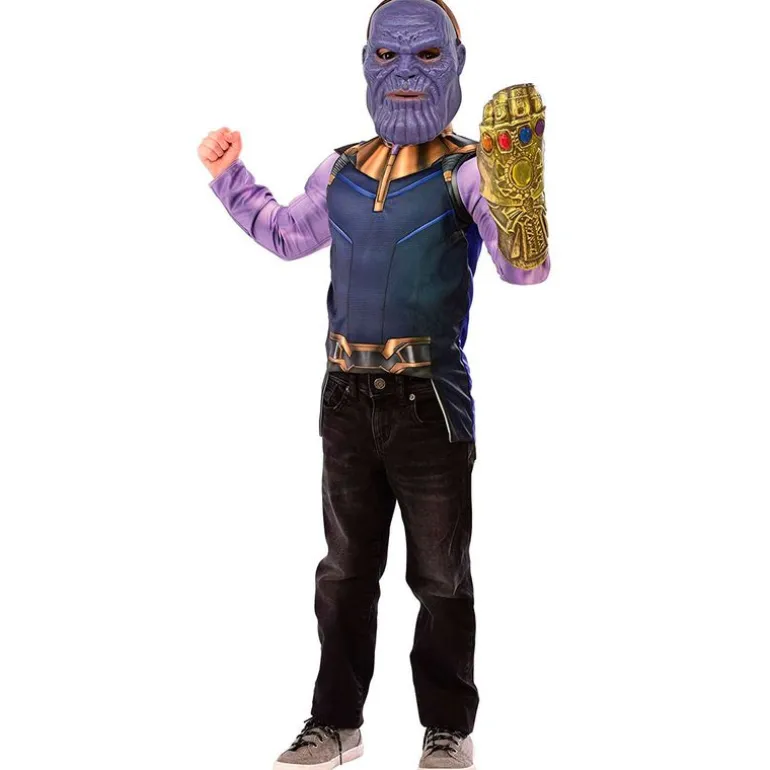 Detallado disfraz del loco titán Thanos, villano principal de la película ‘Vengadores: Infinity War’. El disfraz se compone de la parte superior del traje musculada, la máscara con la cara del titán y su famoso guantelete del infinito. NO incluye pantalones y calzado. Recomendado de 4 a 6 años.