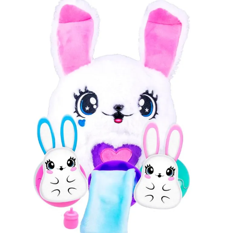 Abre su barriguita y encuentra 2 mini conejitos y una manta para cuidarlos.