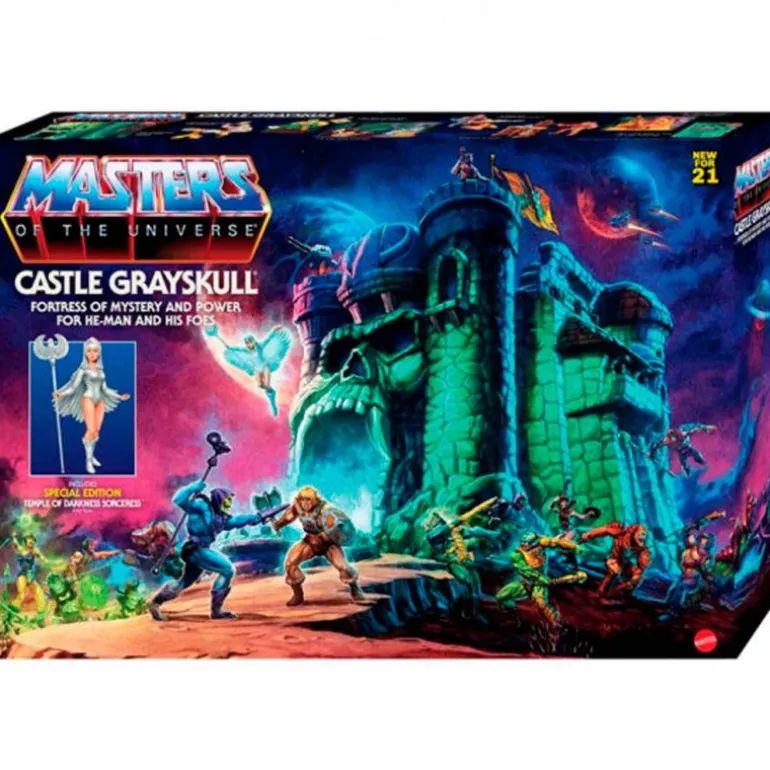 Playset Castillo de Grayskull de la colección inspirada en la mítica serie de animación Masters del Universo. La poderosa fortaleza de Eternia está llena de misterios que deberás descubrir junto a He-man y sus enemigos. Dispone de cuatro espacios de juego diferentes para poder jugar con muchos accesorios temáticos ¡Incluye un ascensor que funciona de verdad y una trampilla! En el interior encontrarás una edición especial de la figura del personaje de la Hechicera ¡Toda una pieza de colección para los fans de la serie! El playset es equivalente con las figuras de 13.9 cm (NO INCLUIDAS/SE VENDE POR SEPARADO). Mide 46 cm de alto aproximadamente e incluye un asa para que puedas cerrarlo y llevarlo contigo a todas partes. Recomendado a partir de 6 años.
