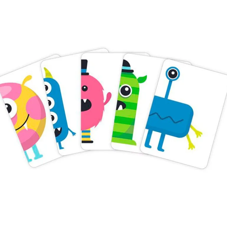 Crea tantos monstruos como puedas juntando las mitades. Los jugadores deben descubrir al monstruo que buscan con tres atributos diferentes ¿Tienes un monstruo rojo con alas azules y un ojo? ¿Tienes un monstruo morado con calcetines a rayas y dos ojos? Gana el jugador con más monstruos completos. De 2 a 4 jugadores. Recomendado a partir de 4 años.