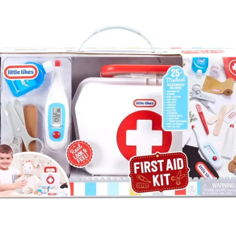 Mi Primer Botiquín de la colección Little Tikes ¡Con 25 accesorios médicos de aspecto realista! Los más pequeños de casa pueden aprender sobre la empatía, la educación y la responsabilidad al simular que cuidan de sus amigos y familiares ¡Anima a l@s niñ@s a participar en juegos de simulación imaginativos! El termómetro muestra diferentes temperaturas para mejorar el juego de roles. Incluye una mascarilla, desinfectante de manos, un cabestrillo para el brazo, un tubo de ungüento, folleto de primeros auxilios, pinzas, tijeras, compresa fría, bajalenguas, un termómetro, 9 vendas, 2 rollos de vendajes, 5 gasas y un maletín de primeros auxilios. Recomendado a partir de 3 años.