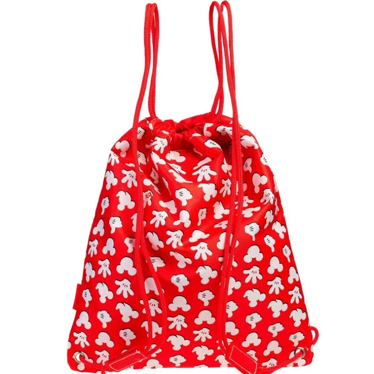 Mochila tipo saco con cierre de cordón en la parte superior y un original diseño inspirado en el personaje de Disney Mickey Mouse. La mochila dispone de un compartimento principal con mayor capacidad y un pequeño bolsillo frontal con cierre de cremallera. Mide aproximadamente: 41 x 35 x 2 cm.
