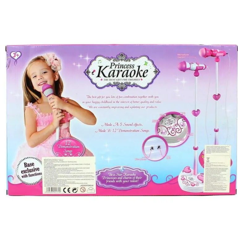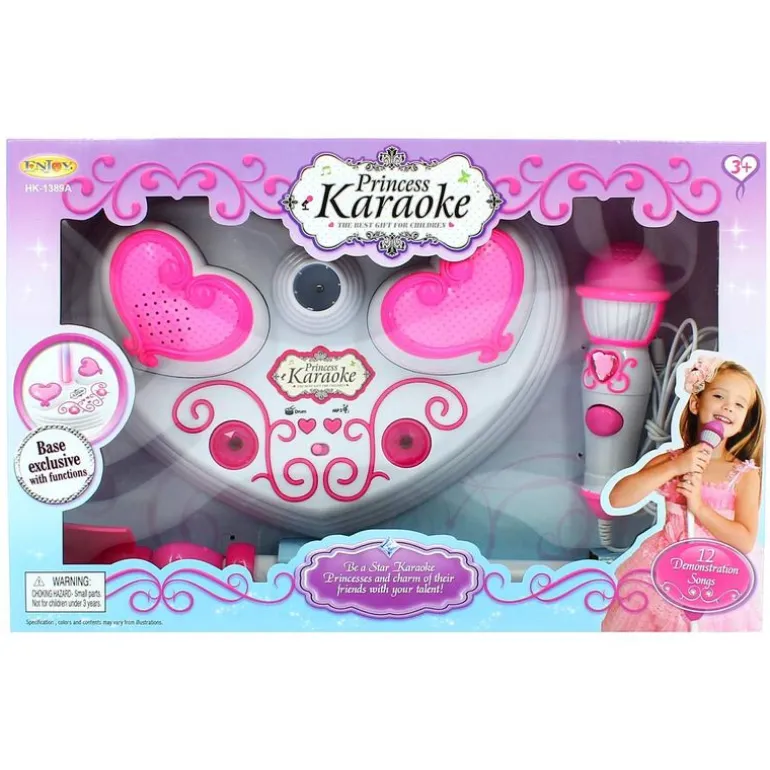 Set de karaoke con un diseños de corazones rosados. El pack incluye microfono y altavoces.