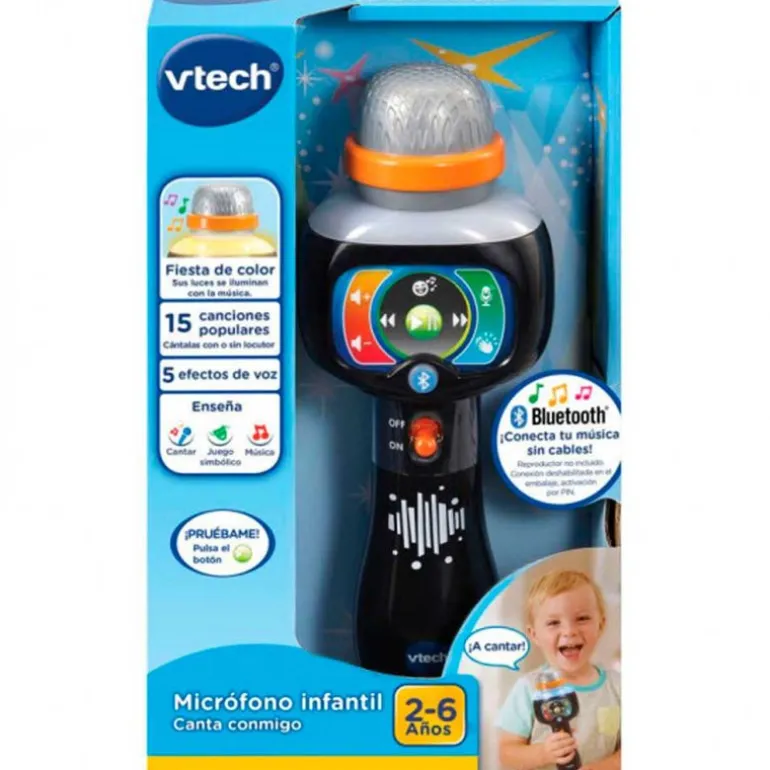 Micrófono infantil con el que los más pequeños de la casa podrán aprender canciones populares ¡Conecta tu reproductor musical de manera inalámbrica o descubre las canciones incluidas! Dispone de Bluetooth para poder cantar las canciones que tú quieras (activación por PIN) 15 canciones incluidas, efectos de voz, fiesta de color con luces que se iluminan con la música. El micrófono tiene unas dimensiones de 21.2 cm x 8.3 cm x 5.6 cm aproximadamente. Funciona con 3 pilas AAA incluidas (pilas de demostración). Recomendado a partir de 2 años.