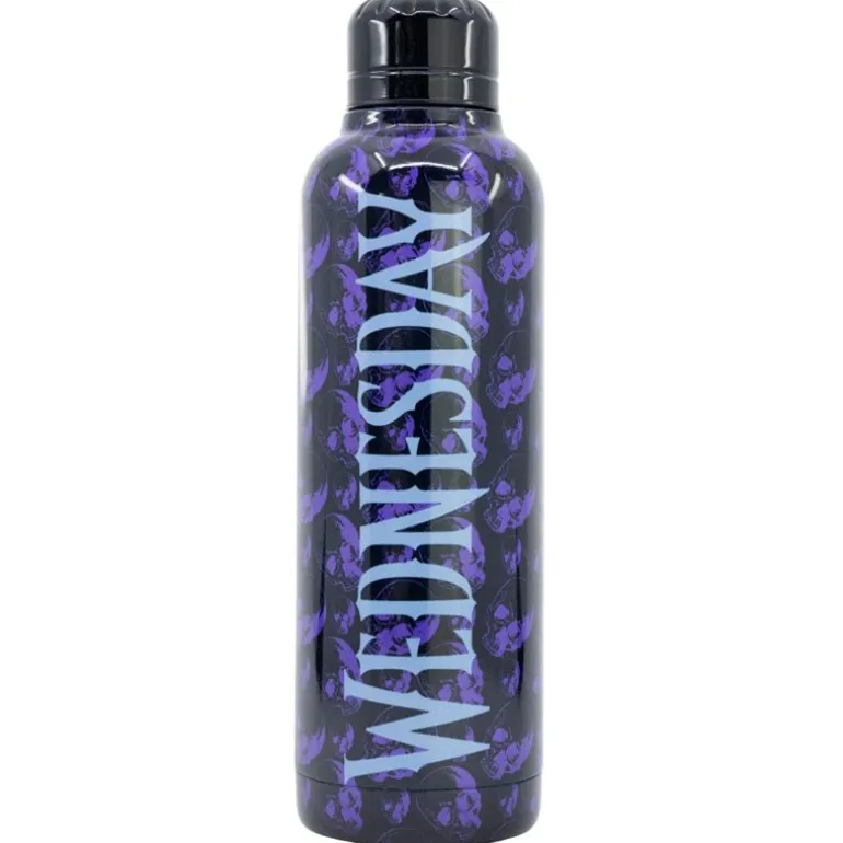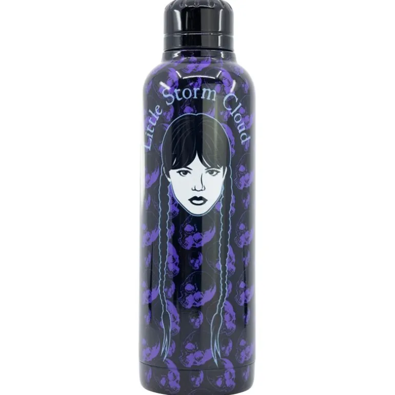 Botella térmica con doble aislamiento, para mantener tus bebidas frias o calientes, con un diseño inspirado en Miércoles Addams. Dimensiones: 24.2 x 7.1 x 7.1 cm Peso: 302 g Composición: Acero inoxidable Capacidad: 515 ml