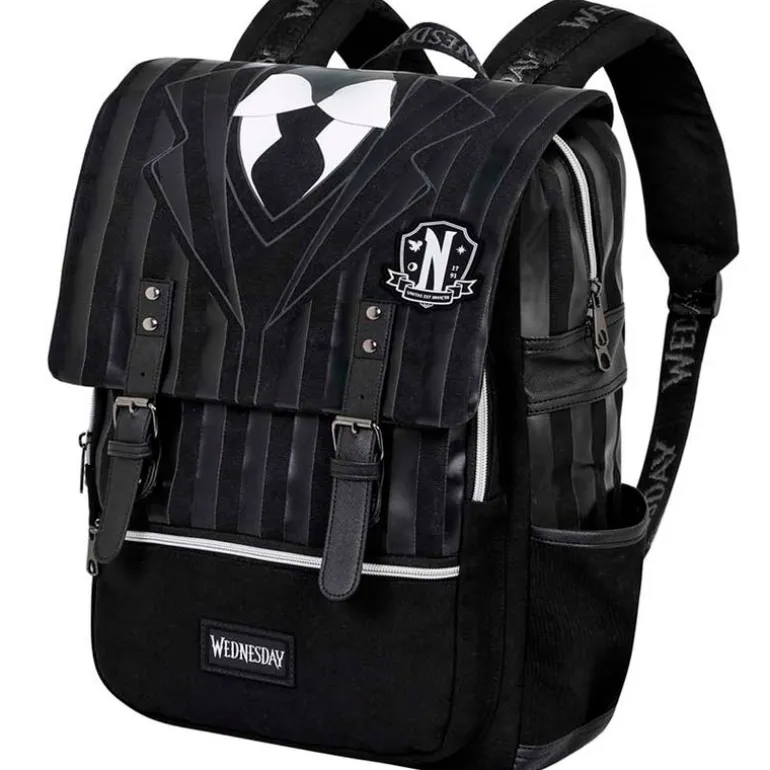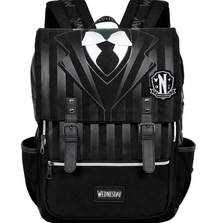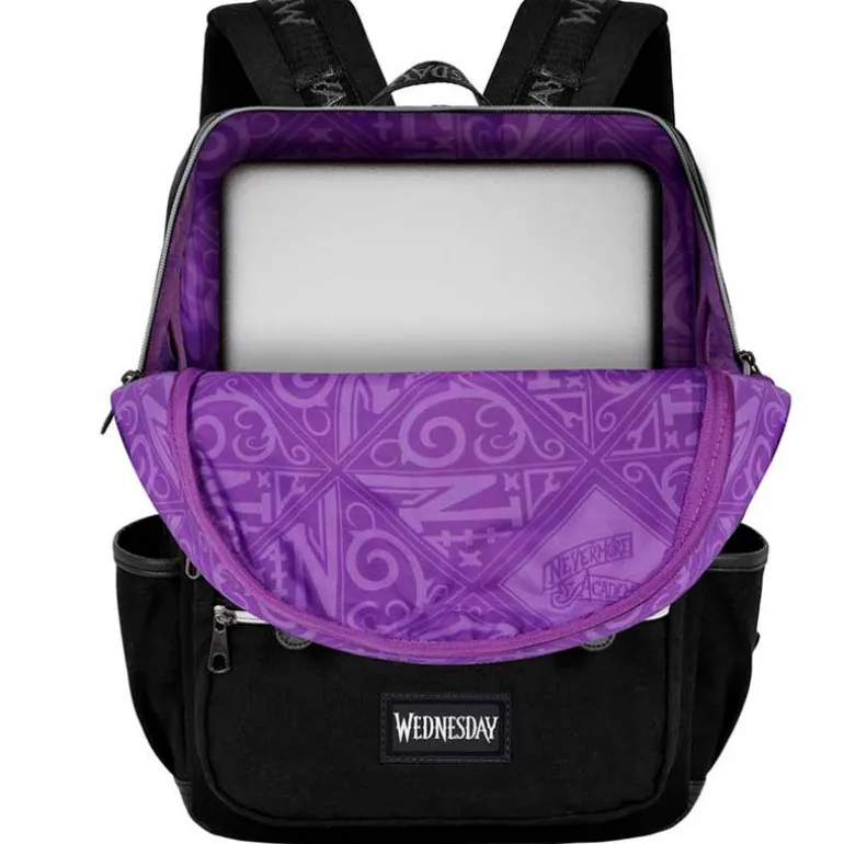Mochila Oxford con diseños inspirados en la serie de Netflix ‘Miércoles’. Dispone de 2 compartimentos, de diferente tamaño, cerrados con cremallera y cubiertos por solapa con tiras. Bolsillos laterales y frontal más divisor interno acolchado para dispositivos electrónicos NO incluidos. Sus dimensiones son de 40 cm x 29 cm x 14 cm aproximadamente.