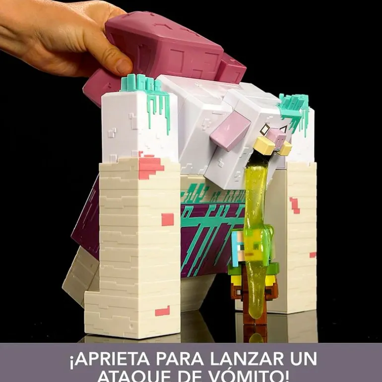 Enorme figura de acción del Devorador, personaje del videojuego Minecraft ¡Con ataque de vómito de slime! Coloca la espora de hongos en el Devorador, carga el slime y prepárate para el ataque. Aprieta la espora para vomitar encima del guardián que se incluye. La figura del guardián tiene un tamaño de 8 cm aproximadamente. Recomendado a partir de 6 años.