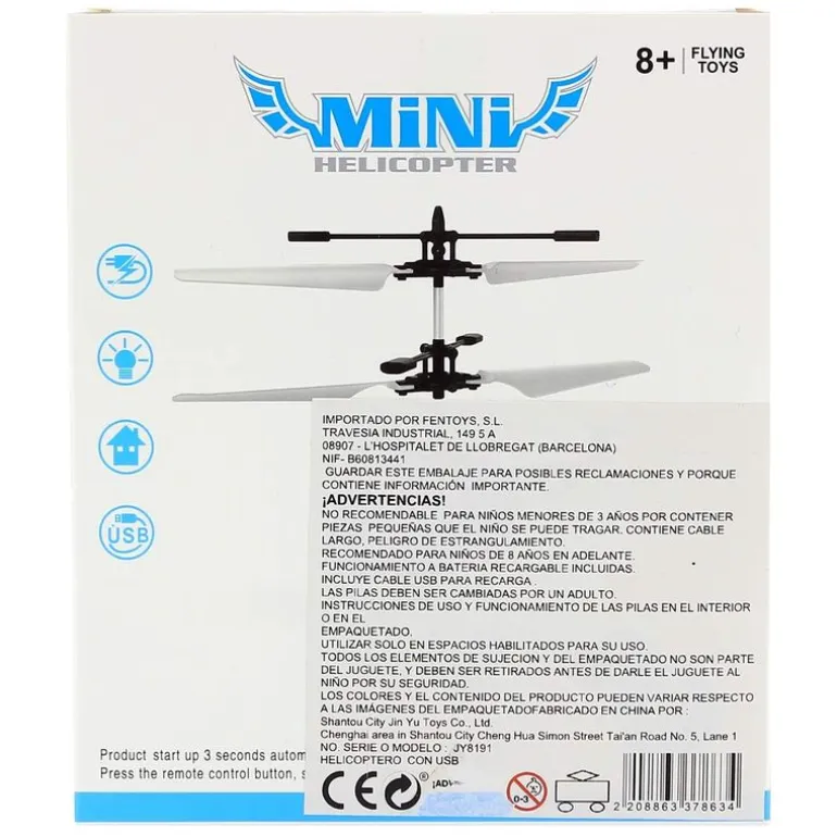 Divertidisimo Helicóptero en miniatura ligero y fácil de controlar. Funciona con un sensor infrarrojo para controlarlo con tu propia mano. Incluye un cargador USB para cargar la batería. No recomendado para menores de 3 años.
