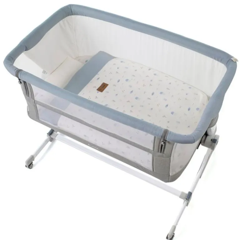 Con patas inferiores telescópicas y 6 posiciones de altura que hacen que sea fácil de adaptar a todo tipo de camas. Además puede utilizarse también como cuna independiente, levantando uno de sus laterales. Con las cuatro ruedas independientes con freno hacen mucho más fácil los desplazamientos y se puede plegar para poder llevarla de viaje. El colchón es reclinable, adaptándose a la posición más cómoda para el bebé.