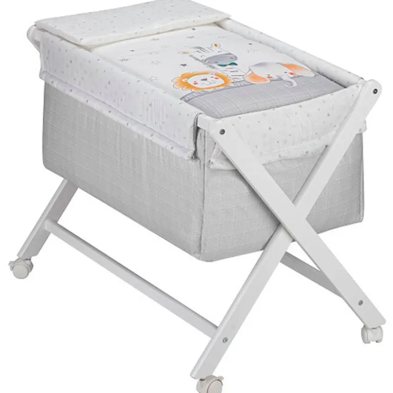 Minicuna fabricada en madera de Haya lacada en blanco . Es completamente plegable y estable gracias a las cintas flexibles que permiten plegarla y al mismo tiempo funcionan a modo de seguro.