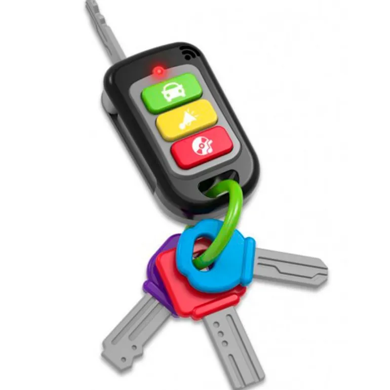 ¡A los más pequeños de la casa les encantará jugar con sus primeras llaves de coche! Contiene 3 llaves de colores que es balancean libremente. El control remoto dispone de 3 botones, que cuando se presionan, abre la llave del coche, reproducen música y se iluminan. Ideal para el desarrollo de las habilidades de destreza y el descubrimiento de colores. Funciona con 2 pilas AAA incluidas (pilas de demostración). Recomendado a partir de 1 año.