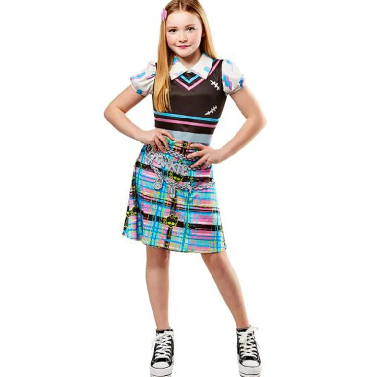 Disfraz de la colección Monster High que se compone de un vestido con detalles impresos y un clip para el pelo en forma de rayo. NO contiene peluca, accesorios ni calzado.