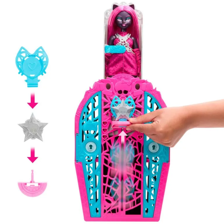 Inserta el talismán en la ranura del armario, deslízalo hacia arriba y prepárate para hacer un maullante descubrimiento: la muñeca Catty Noir. Repite los pasos una y otra vez para divertirte sin parar.