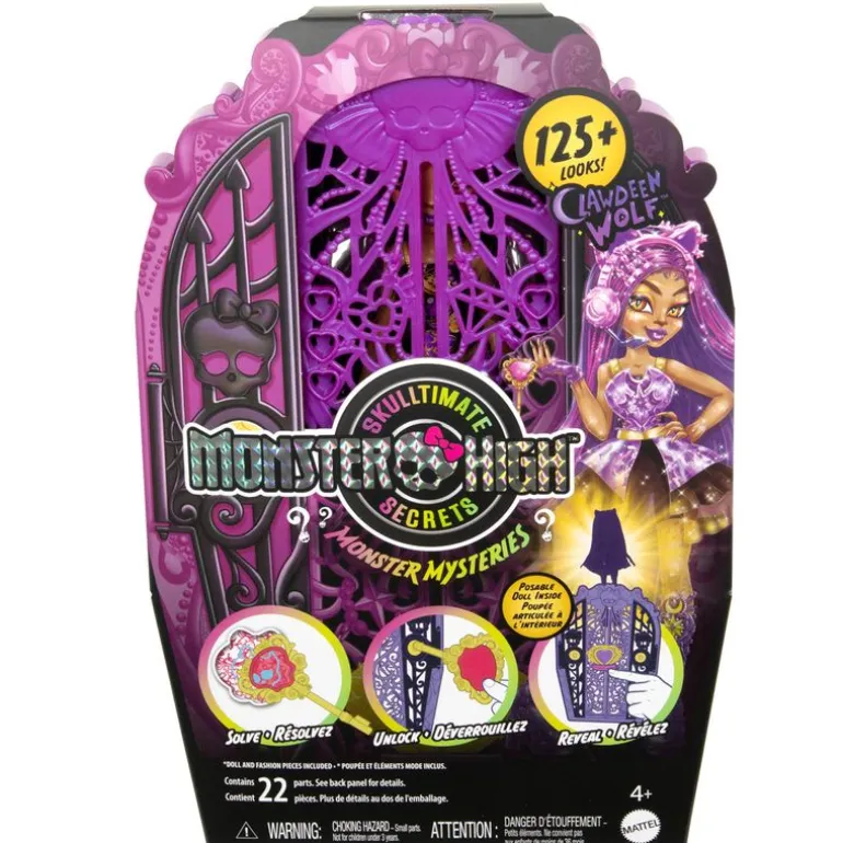 ¡Resuelve el secreto, abre las puertas de Monster High y revela la muñeca Monster High Skulltimate Secrets: Monster Mysteries! Activa las pistas en la tarjeta con la magia “Low Key”. Descubre la muñeca de Clawdeen Wolf acompañada de 19 accesorios. Recomendado a partir de 4 años.