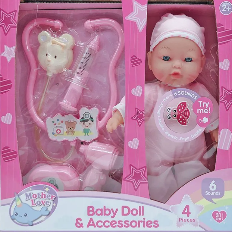Muñeco bebé blandito acompañado de accesorios médicos para que lo puedas cuidar cuando se ponga malito. Incluye 4 accesorios diferentes. El tamaño del muñeco es de 31 cm aproximadamente y reproduce 6 sonidos diferentes. Funciona con pilas incluidas (pilas de demostración). Recomendado a partir de 2 años.
