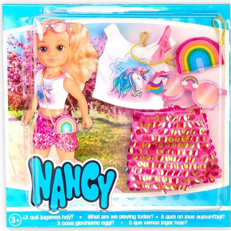 Pack de la colección Nancy en el que encontrarás un outfit inspirado en unicornios. Contiene una camiseta con un unicornio, una falda de purpurina fucsia, un bolso con forma de arcoíris y unas gafas reflectantes. Recomendado a partir de 4 años.