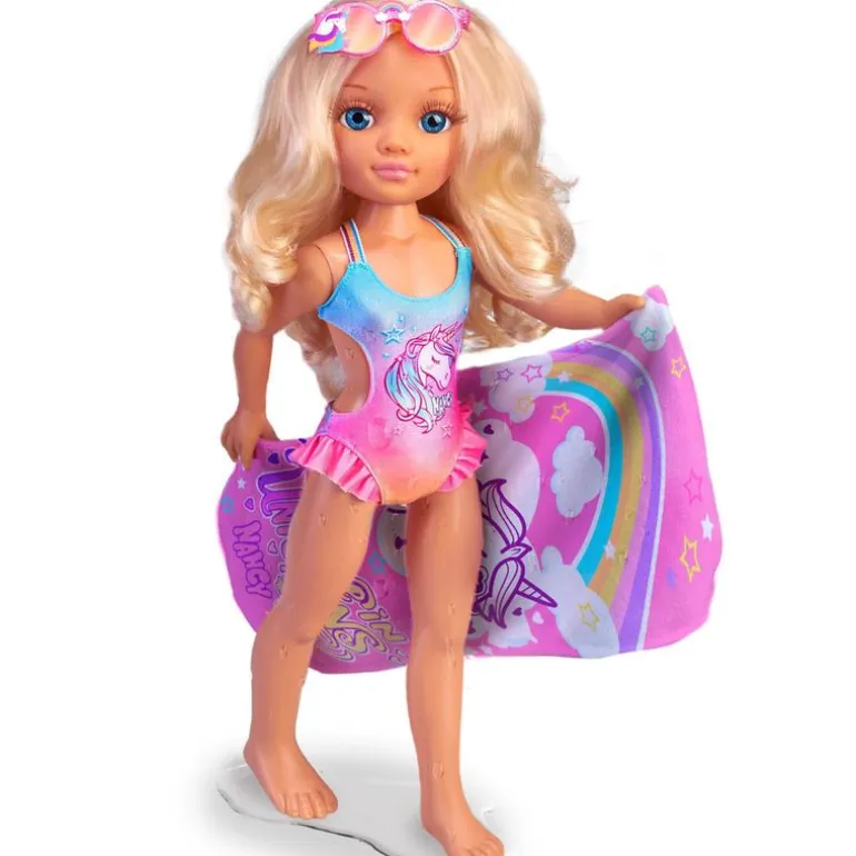 Nancy está lista para el verano con su toalla mágica. La muñeca viene acompañada de una toalla que cambia de color con el agua, al mojarla aparecerá un mágico diseño de un unicornio. Recomendado a partir de 3 años.