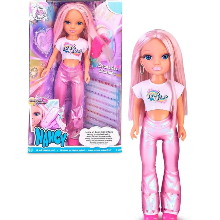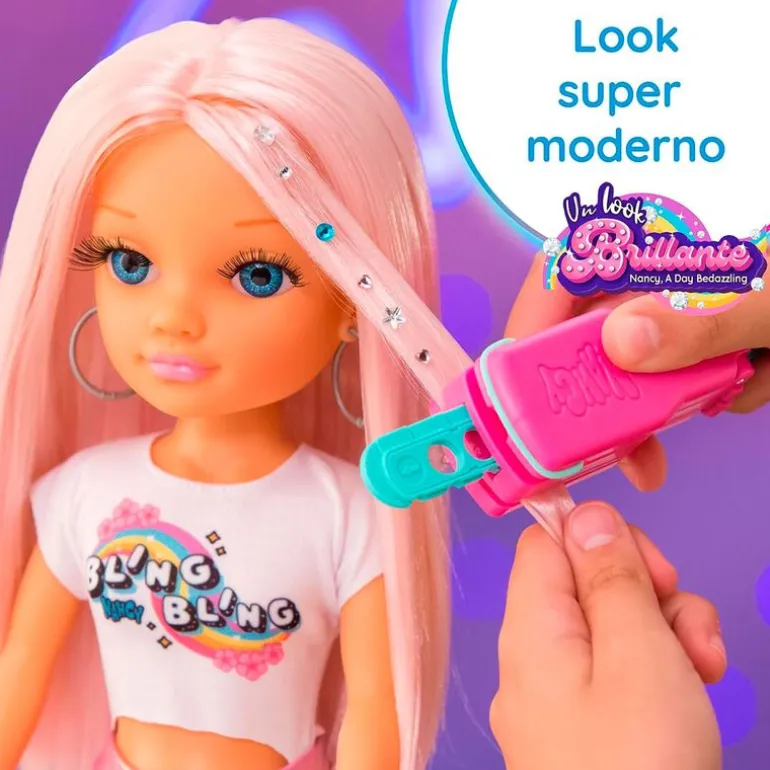 Muñeca Nancy con la que podrás crear llamativos peinados mientras decoras el cabello de tu muñeca favorita. En el interior encontrarás una máquina de gemas para pegar los brillos en el pelo de Nancy… ¡Y en el tuyo también! Con más de 80 brillos de diferentes colores muy sencillos de pegar. La muñeca tiene un tamaño de 45 cm aproximadamente. Recomendado a partir de 3 años.