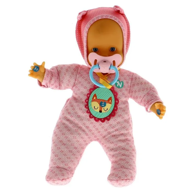 Si aprietas sus manos dirá pa-pa y ma-ma, si aprietas su barriguita se reirá, si le das el chupete hará sonidos de succión pero si se lo quitas se pondrá a llorar.