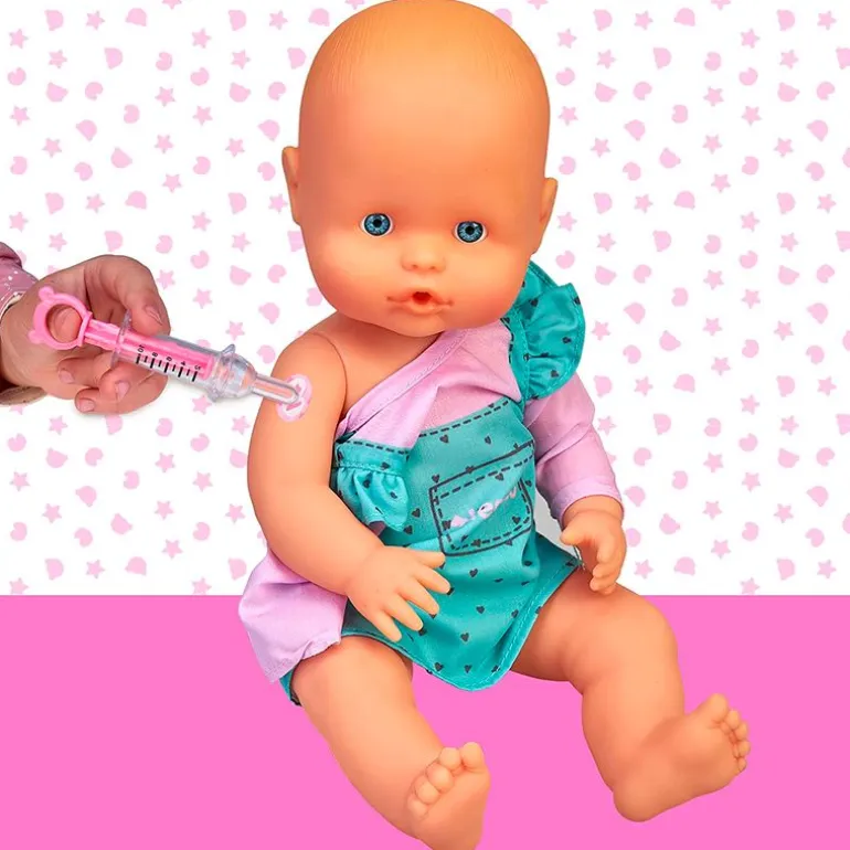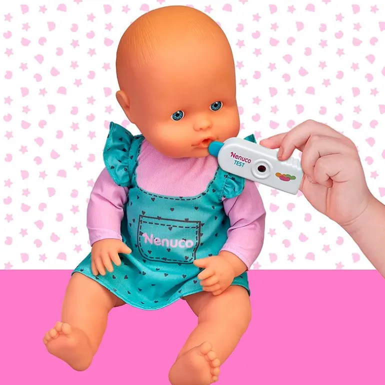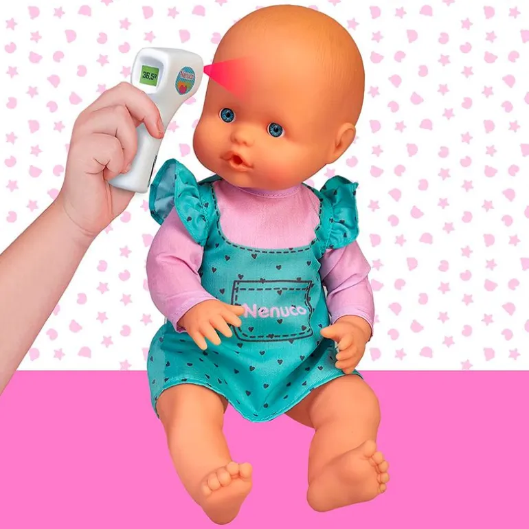 Nenuco ¿Estás Malito? Es un adorable muñeco bebé al que tendrás que hacerle una revisión con todos los accesorios y medicinas que encontrarás en el interior del pack. Reproduce sonidos para saber qué le pasa a Nenuco, su termómetro tiene luz para tomarle la temperatura. Dependiendo de su temperatura podrás hacerle un test, si sale rojo o verde, al azar, indicando si tu bebé está bueno o malito. Viene acompañado de una mascarilla para que siempre vaya protegido. Nenuco tiene un tamaño de 35 cm aproximadamente, podrás vestirlo y desvestirlo y su ropa se puede lavar. Incluye una vacuna, cartilla de vacunación, jarabe o tiritas. Recomendado a partir de 3 años.