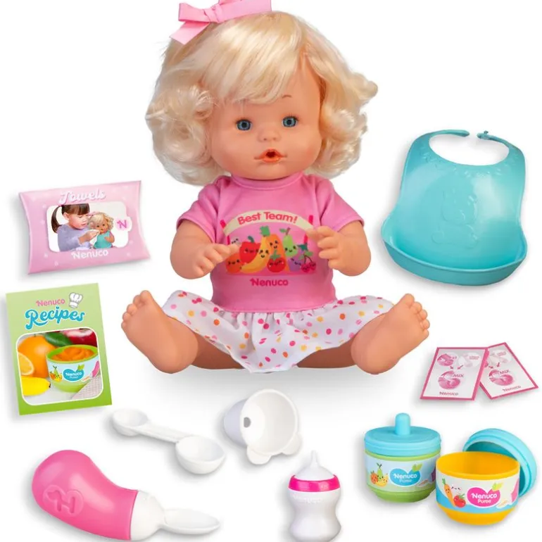 Nenuco mi primera papilla es un muñeco de 35 cm y cuerpo duro, tiene un precioso pelo rubio rizado y lleva un vestidito rosa y un lazo en el pelo.