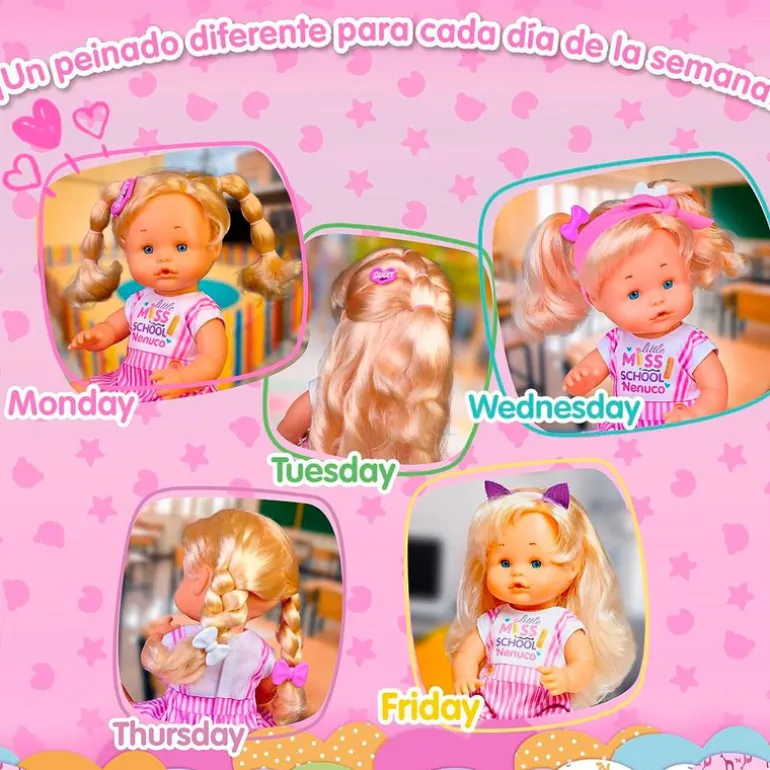 Nenuco es una adorable muñeca bebé con pelo largo a la que podrás hacer un peinado diferente para cada día de la semana. Viene acompañada de más de 10 accesorios de peluquería entre los que encontrarás un secador, un trenzador de pelo, horquillas, una diadema y gomas. Su tamaño es de 35 cm aproximadamente y su cuerpo es duro. Recomendado a partir de 3 años aproximadamente.