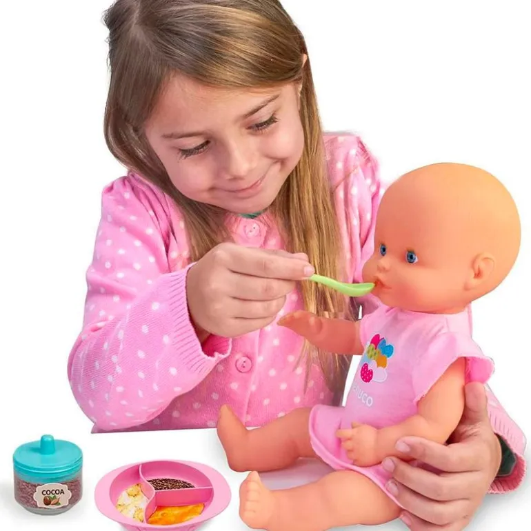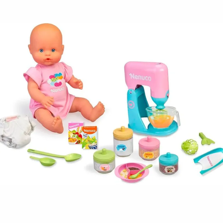Nenuco ¿Qué comemos hoy? Es un pack en el que encontrarás un muñeco con mecanismo interno (sin pilas) que le permitirá comer papilla y hacer caca. Viene acompañado de recipientes, cuencos y un medidor para hacer las recetas correctamente. Incluye una batidora de mano con 3 cabezales distintos y una batidora para amasar. Busca el libro de recetas y podrás hacer las mejores papillas. Con la cuchara podrás dar la papilla a tu Nenuco ¡Después hará caquita! Tendrás que cambiarle el pañal. El muñeco tiene un tamaño de 42 cm aproximadamente, con cuerpo duro y ropa intercambiable y compatible con la colección Nenuco.