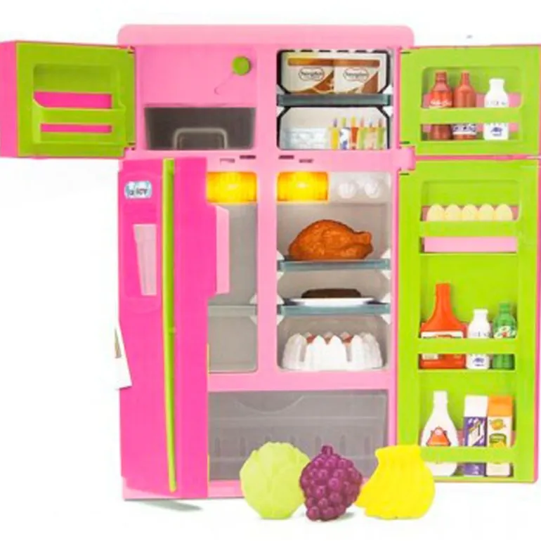 Dispone de diferentes compartimentos en los que colocar la comida, una máquina para agua fria y un horno con sonidos de verdad.