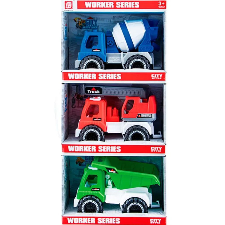 Pack que contiene 3 vehículos de tipo obra que funcionan a través de fricción. Recomendado a partir de 3 años.
