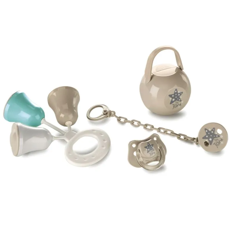 Set de regalo de nacimiento que incluye: 1 chupete de silicona, 1 cadena portachupete, 1 cajita guarda chupetes y un sonajero!!