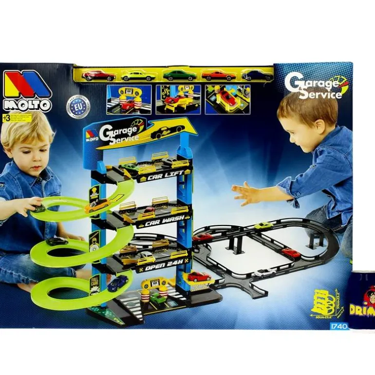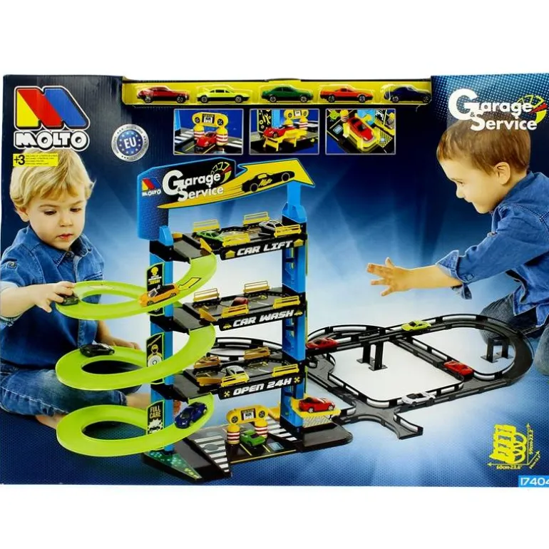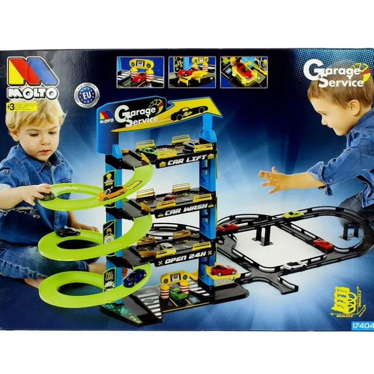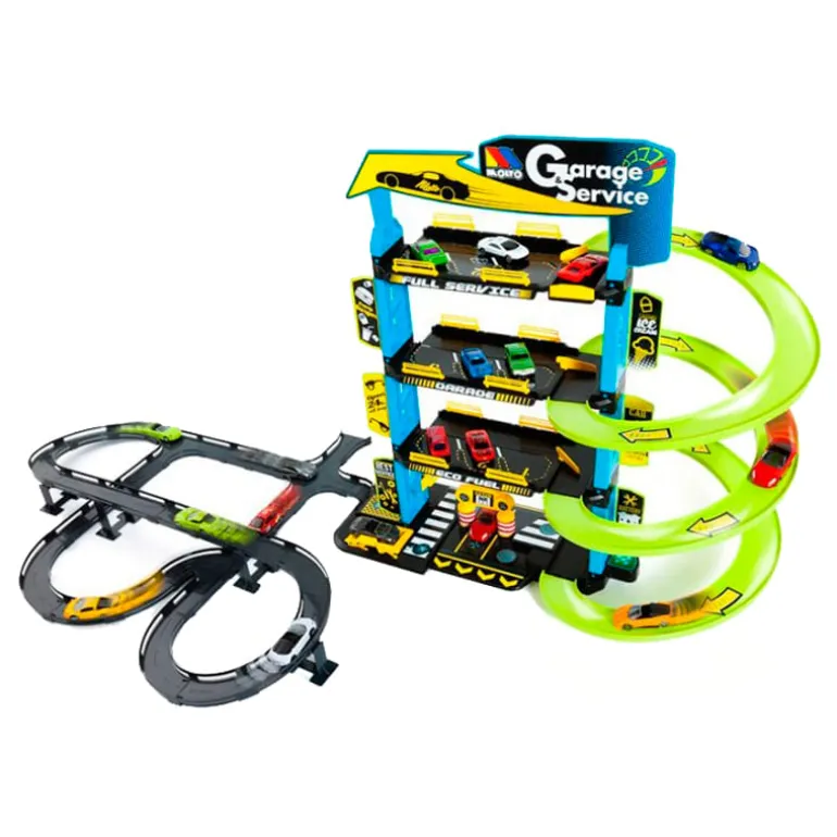 Resistente parking de 4 plantas con amplios espacios de aparcamiento, ascensor manual, gasolinera, túnel de lavado y tramos de pista. Incluye, además, 5 vehículos para que puedas empezar a jugar sin tener que esperar. Medidas aproximadas del parking montado: 61 x 57 x 56 cm.