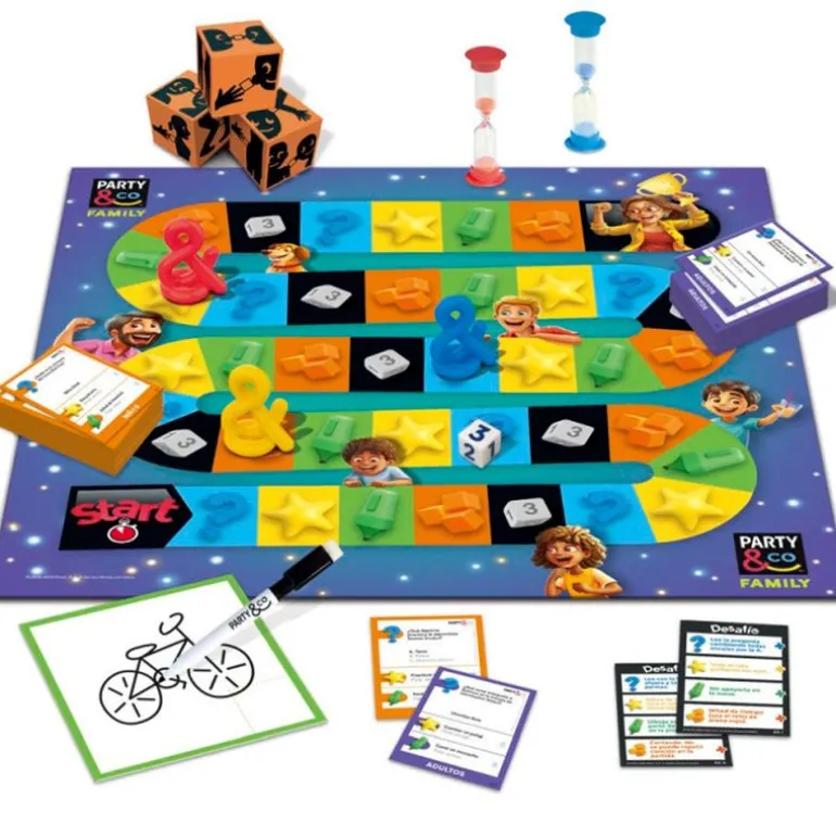 En el interior encontrarás 2 tableros en 1, 2 tipos de preguntas para niños y para adultos con 300 tarjetas, 3 cubos de fiesta, una pizarra, un rotulador borrable, 2 relojs de arena y 3 peones.
