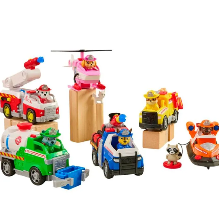 Vehículo inspirado en la colección Patrulla Canina Fire Rescue acompañado de un personaje de la serie de animación.