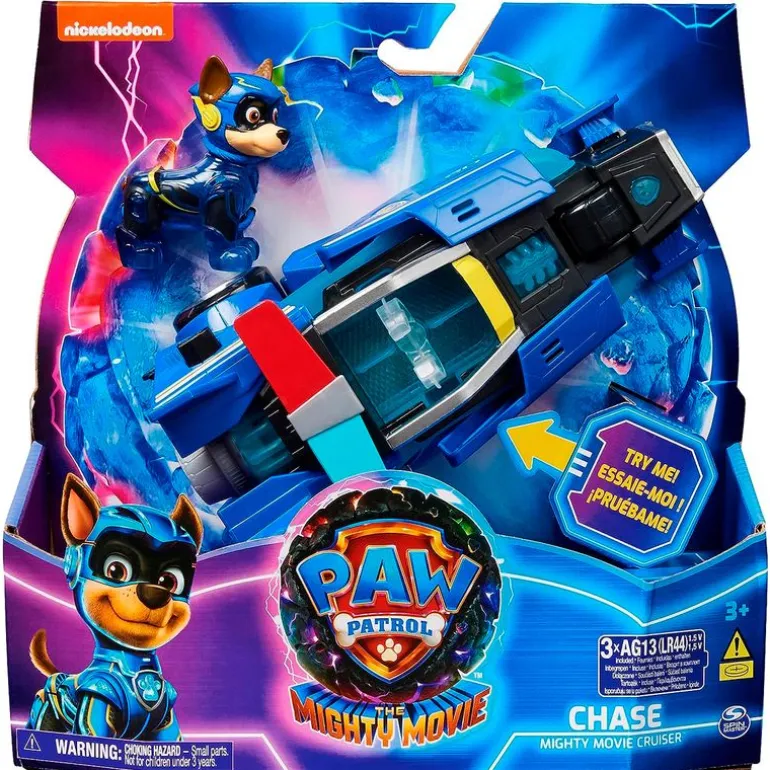 Vehículo inspirado en la película de animación Patrulla Canina Mighty Movie. Viene acompañado de Chase. Con partes translúcidas que se iluminan cuando el cachorrito se encuentra en el vehículo. Funciona con 3 pilas LR44 incluidas (pilas de demostración). Recomendado a partir de 3 años