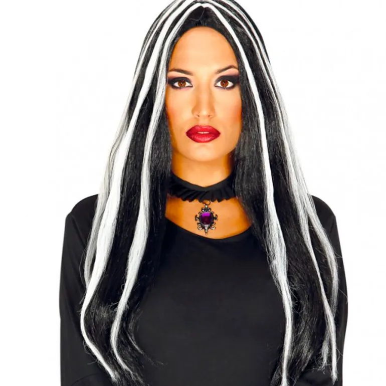 Peluca negra con mechones blancos con la que podrás disfrazarte de carnaval o de bruja. NO incluye complementos o disfraz.