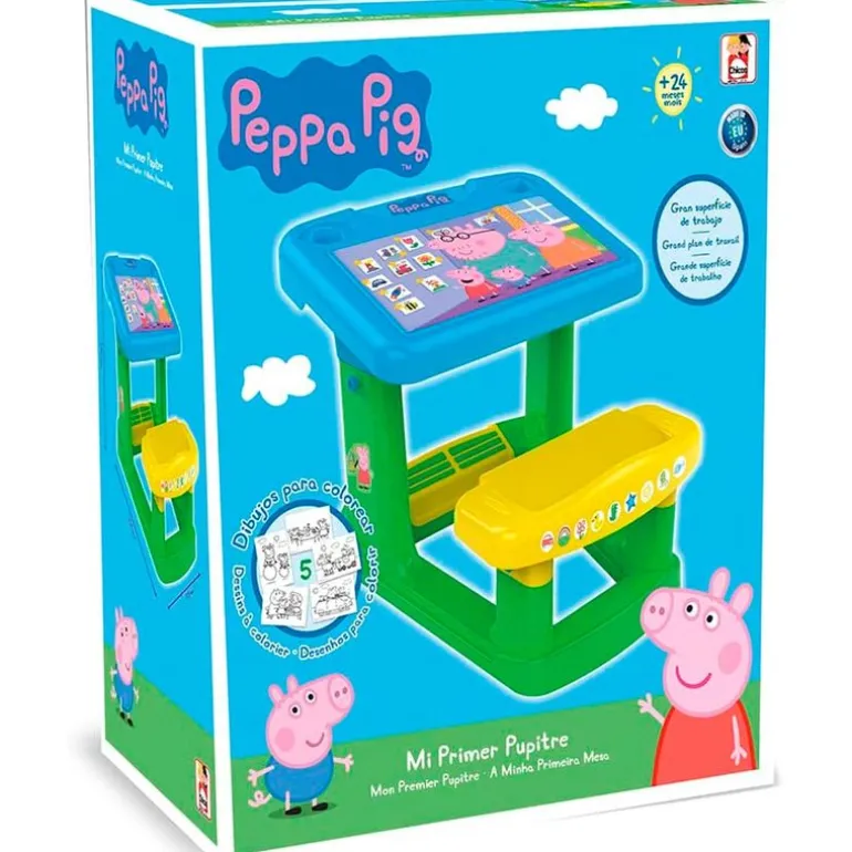 Pupitre para los más pequeños de la casa con diseños inspirados en la serie de animación Peppa Pig. Está fabricado en plástico de gran resistencia y durabilidad. Sus dimensiones son de 58.5 cm x 65.5 cm x 34.5 cm aproximadamente. Recomendado a partir de 2 años.