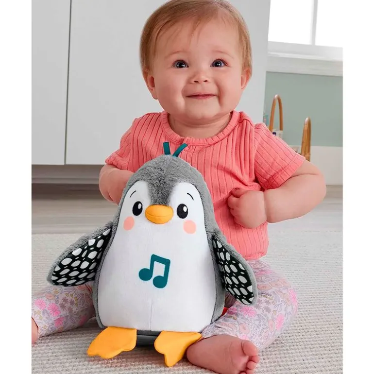 Adorable peluche Pingüino Aleteos y Tamaleos de la colección Fisher Price. Este simpático animalito reacciona con divertidos aleteos y reproduce música cuando el bebé lo toca. A medida que tu bebé vaya creciendo, la base tambaleante del pingüino animará a sentarse y dar golpecitos al peluche para escuchar sus melodías y ver sus tambaleos y aleteos. Ideal para el desarrollo de la vista, tacto y oído de los bebés recién nacidos. Las dimensiones del pingüino son de 23.5 cm de alto x 26 cm aproximadamente. Funciona con 4 pilas AA incluidas (pilas de demostración). Recomendado a partir de 0 meses.