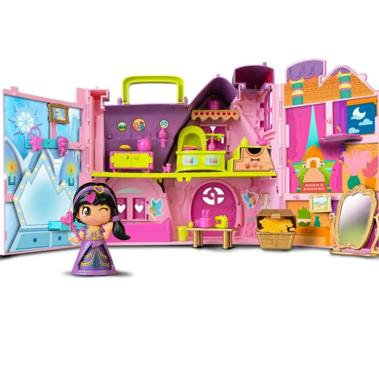 Viene con la figura de la Princesa Jazmín. Incluye la habitación y camita rotatoria de Ricitos, escenarios de cuento para las mil y una noches con la alfombra mágica, el reino del Hielo, el Bosque Encantado, una cocinita, un taller y un espejito mágico rotatorio.