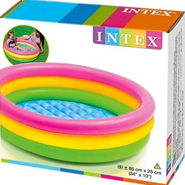Piscina hinchable con 3 anillos para los más pequeños de la casa. Sus dimensiones son de 86 cm x 25 cm aproximadamente. Capacidad de 56 litros.
