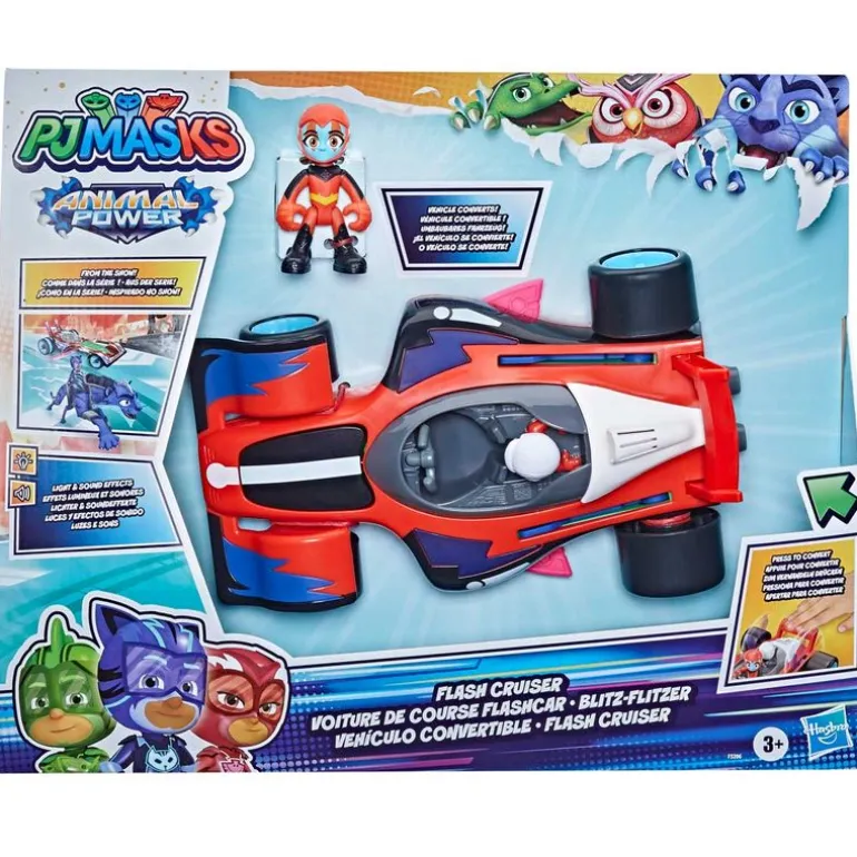 Flash cruiser es un vehículo convertible de la colección Animal Power, inspirada en la serie de animación PJ Mask. El vehículo reproduce luces y efectos de sonido ¡Presiona el alerón para convertirlo! Aparecerá el capó blindado de Gekko, las alas de Buhíta y los alerones de Gatuno. Incluye la figura de un personaje de la serie de animación. Funciona con 3 pilas LR44. Recomendado a partir de 3 años.